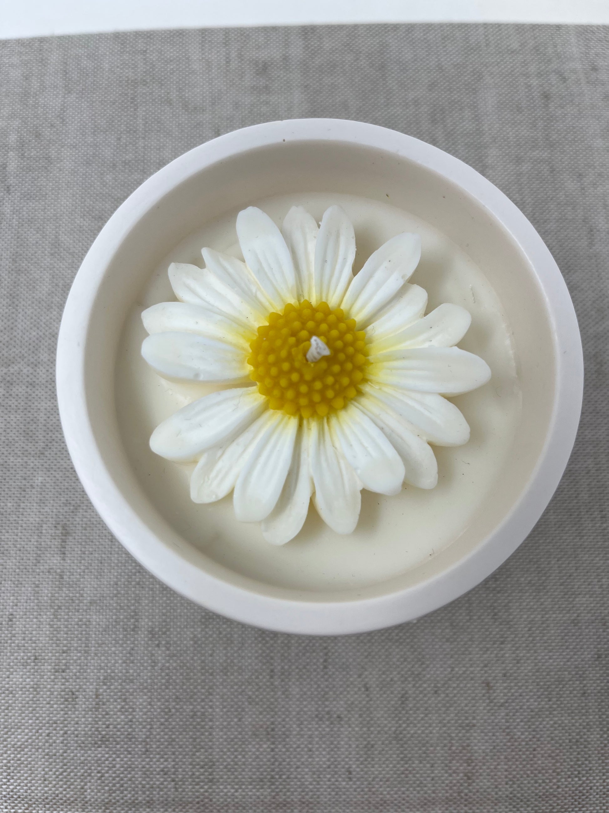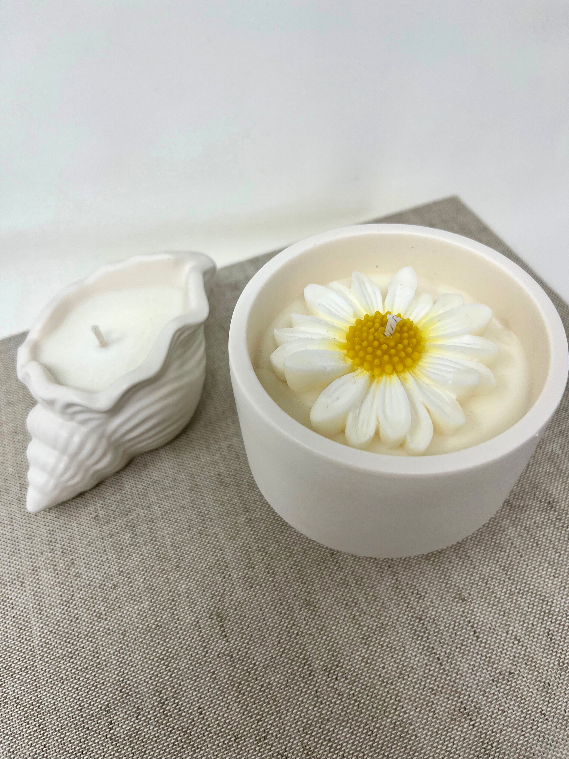 Nuestras velas con mecha de algodón están hechas a mano en recipientes neutros únicos y decoradas con una flor de manzanilla.