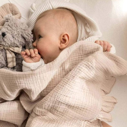 La manta muselina es perfecta para acurrucarse o como manta suave en el cochecito. Disponible en dos colores.