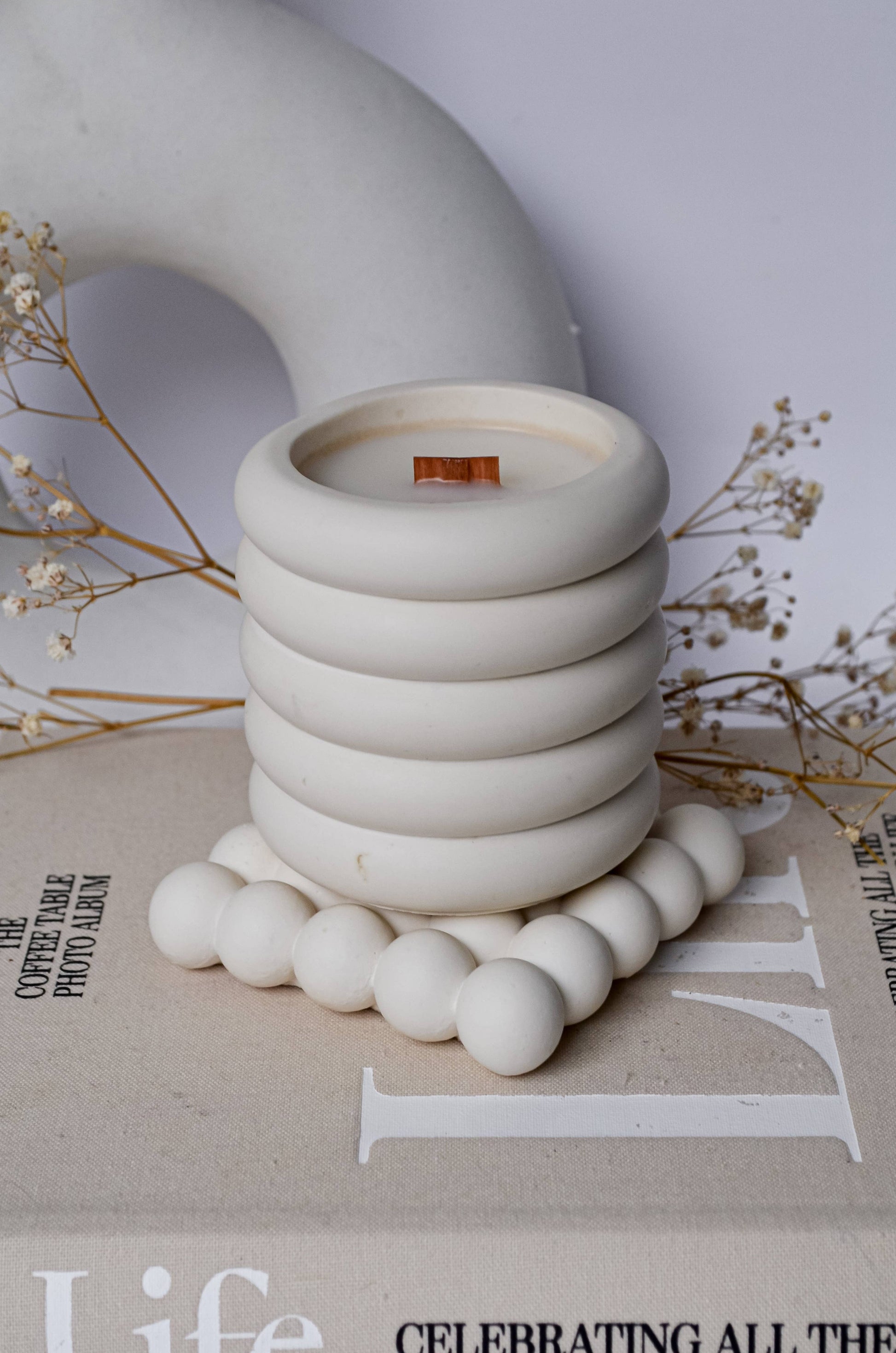 Nuestras velas con mecha de madera, presentadas en una bolsa de algodón reutilizable, están hechas a mano en recipientes únicos de color blanco roto.